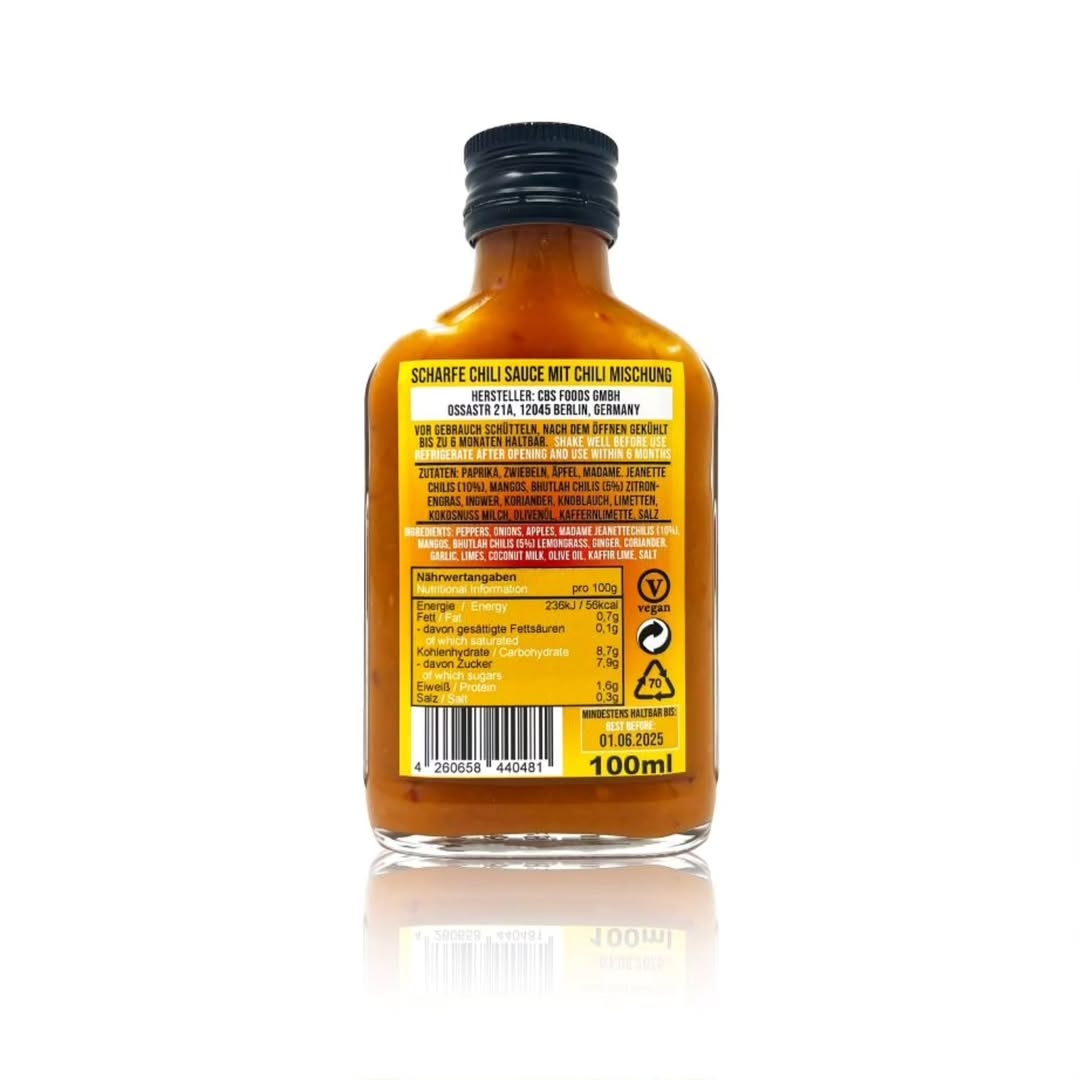 Markanın sık sık başvurduğu bir yol sınırlı sayıda acı sos çıkarmak. Ellerinde az sayıda bulunan biberleri kullanma bahanesiyle yeni tarifler deniyorlar. Bu sosta kullandıkları biberler limonsu ferahlığıyla bilinen Madame Jeanette ile yoğun ve sert acısıyla tanınan Bhutlah. Ayrıca egzotik Tayland aromalarını yakalayabilmek için limon otu, zencefil, kaffir lime ve kişniş kullanmışlar. Ancak sosu ağzınıza götürür götürmez elmanın ve mangonun tatlılığını alıyorsunuz. Ardından biberlerin acısı geliyor ve kapanışı sarımsak ile birlikte saydığım diğer lezzetler yapıyor.